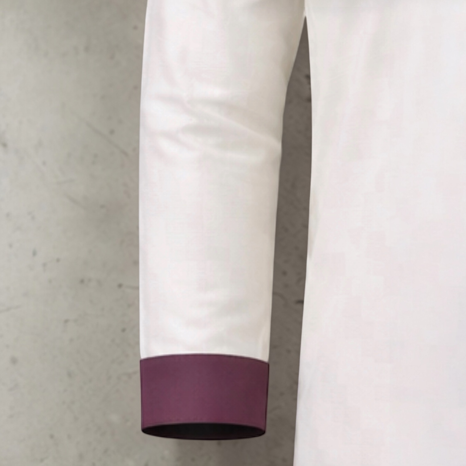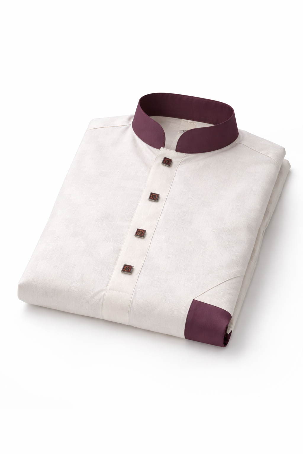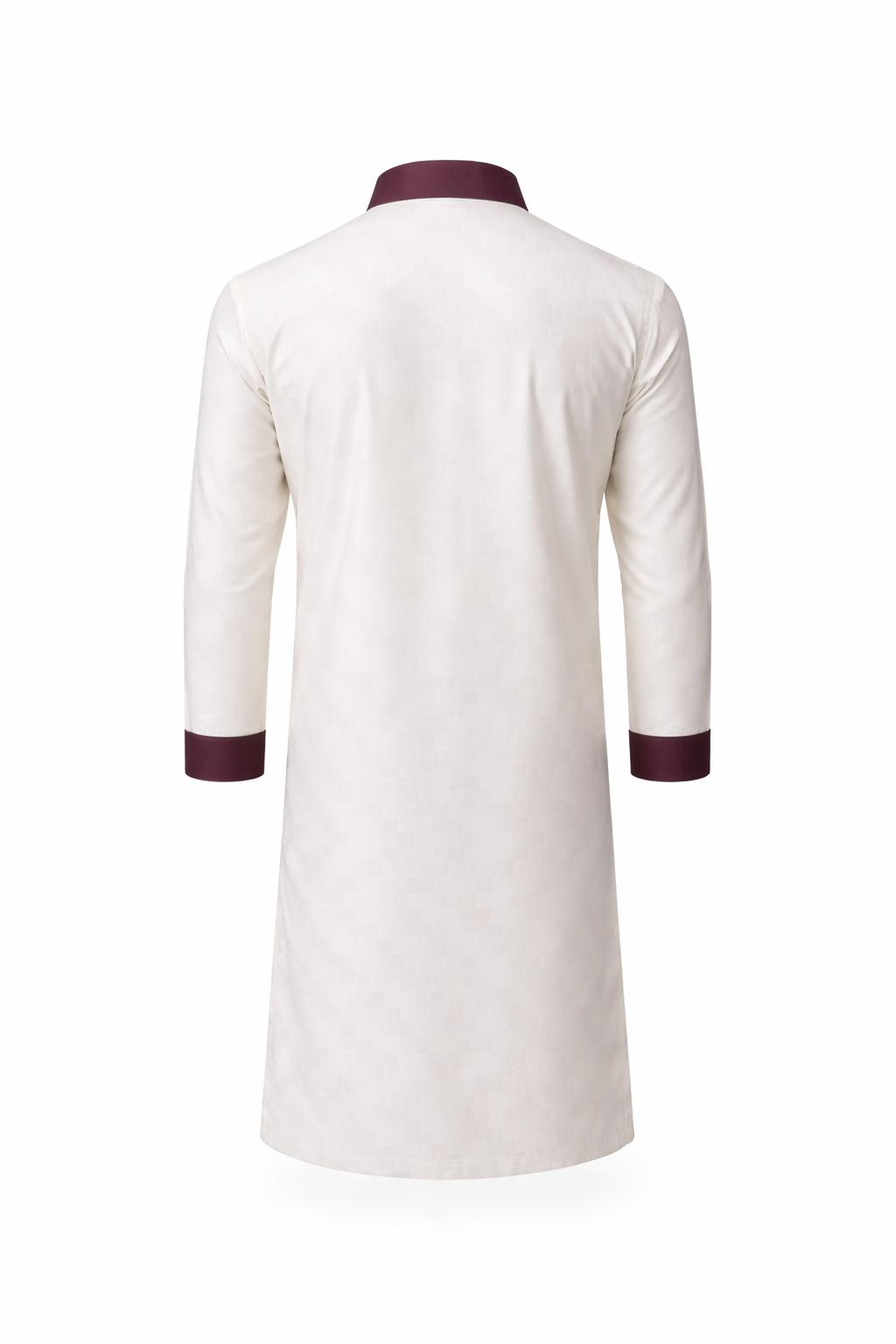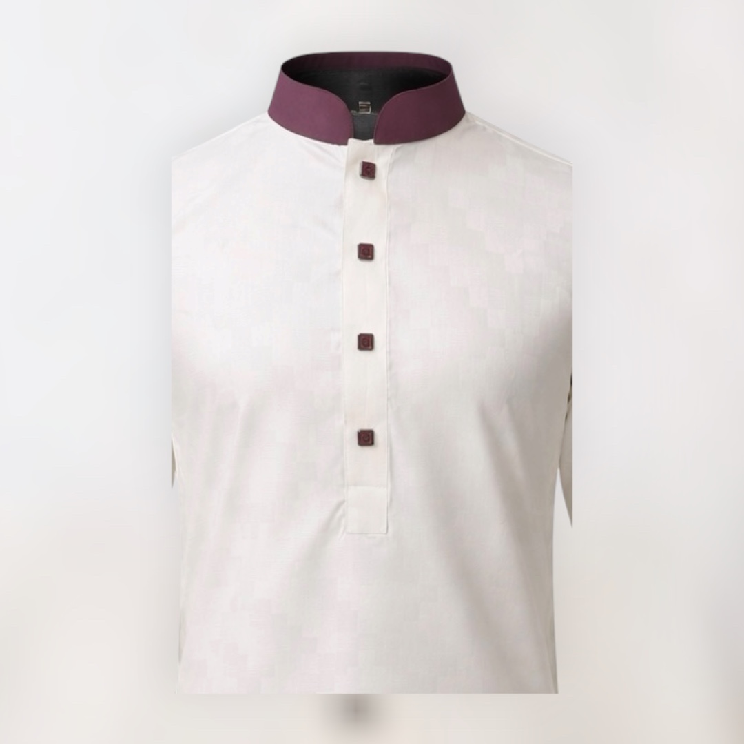 The deep mauve contrast collar and cuffs add a distinctive signature touch, perfectly balanced with matching square buttons along the placket. The overall design remains minimal yet powerful — ideal for festive occasions, Jummah, or elegant evening wear.